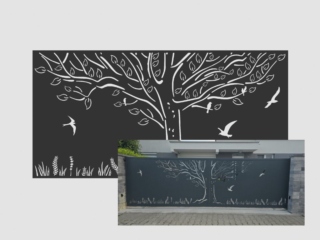 Designový plotový dílec, výplň - Strom a ptáci