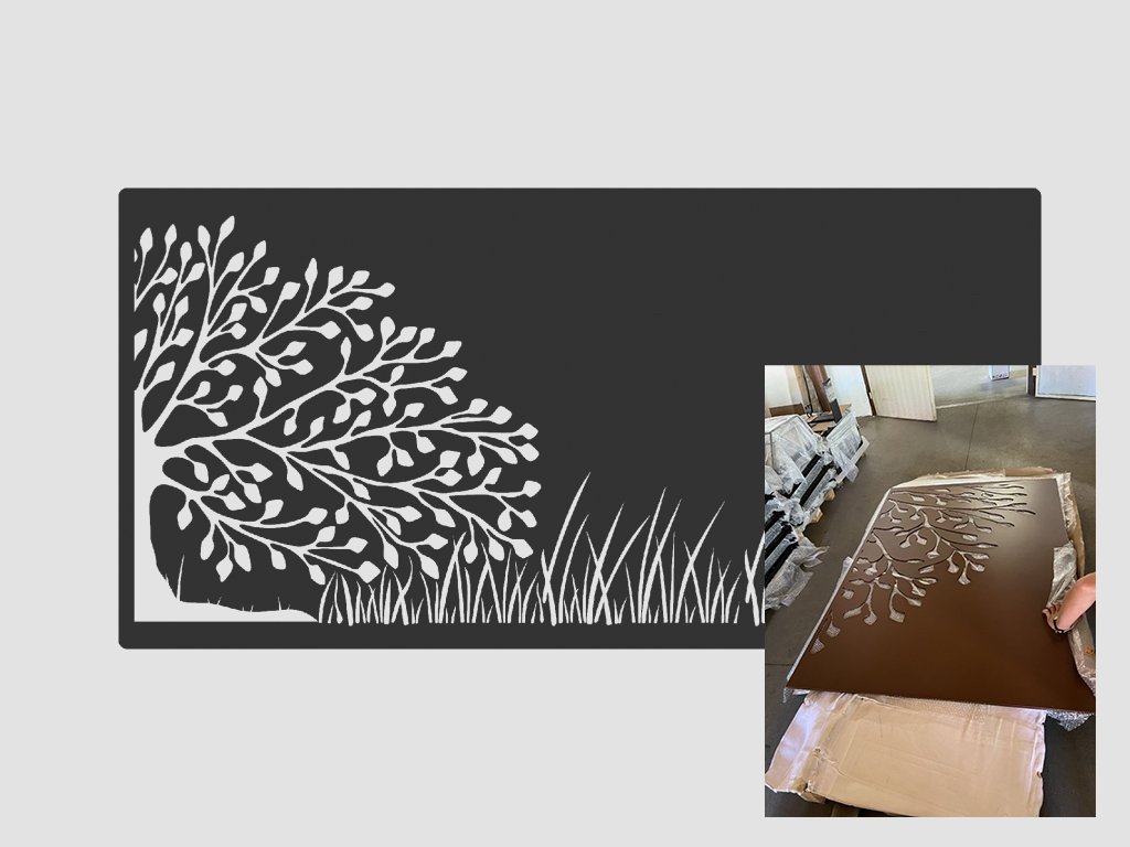 Vzory jsou vypáleny laserem do kvalitních plechů. Tloušťka plechu je u oceli, nerezu, cortenu a pozinku 2mm, pro hliník 3mm.